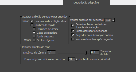 - Permite definir a taxa de quadro em quadros por segundo que a exibição adaptativa tentará manter. Se a taxa de quadro ficar abaixo deste valor, o 3ds Max irá aumentar a quantidade de degradação com base nas outras configurações deste painel. Defaut (Padrão)=10,0.