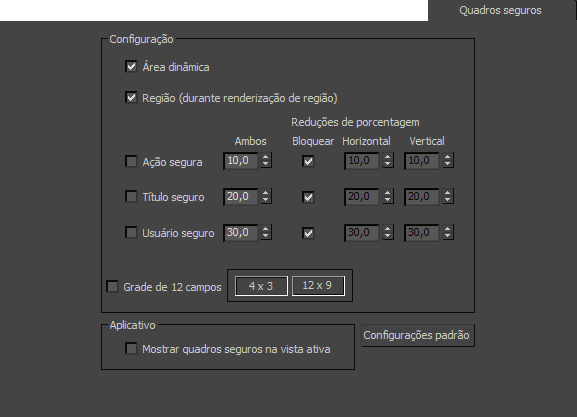 É possível alternar o status de quadros seguros para a viewport ativa premindo Shift + F ou usando o menu de etiquetas da Viewport de ponto de vista (Point-Of-View, POV). Você pode usar o painel Quadros seguros da caixa de diálogo Configuração da viewport para ajustar os parâmetros.