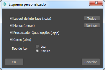 Após você inserir um nome de arquivo base e clicar em Salvar, aparece a caixa de diálogo Esquema Personalizado. Na caixa de diálogo Esquema Personalizado, você define os tipos de esquemas de interface do usuário a salvar. Um arquivo é salvo para cada tipo de esquema que você selecionar, cada um com uma extensão específica para aquele tipo de esquema. Quando você carrega um dos arquivos de esquema UI personalizado com a caixa de diálogo Carregar Esquema UI Personalizado, o conjunto completo dos arquivos com o mesmo nome de arquivo base é carregado.