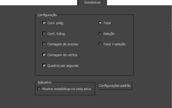 As Estatísticas podem ser atribuídas à cena ou à seleção ativa; elas também podem apresentar uma contagem em tempo real do número de quadros por segundo exibidos. Para alternar a exibição das estatísticas numa janela durante o processo, selecione o menu de etiqueta de janela Geral e, depois, xView