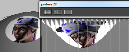 A imagem, aplicada diretamente à superfície da esfera perto da parte superior (esquerda), aparece distorcida na janela Pintura 2D.