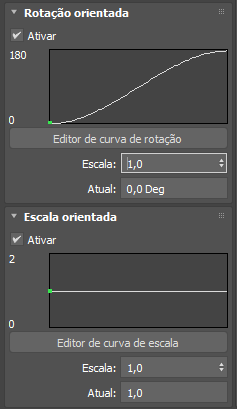 A curva desenhada representa o valor calculado ao longo do caminho da spline de orientação. O valor de 0% será sempre igual a 0 grau de rotação/escala.