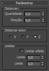 O modificador de torção produz um efeito de twirling (como wringing uma molhado rag) em um objeto de geometria. Você pode controlar o ângulo do giro em qualquer um dos três eixos, e definir uma inclinação que comprime a torção efeito em relação ao ponto de pivô. Também é possível limitar a torção para um corte da geometria.