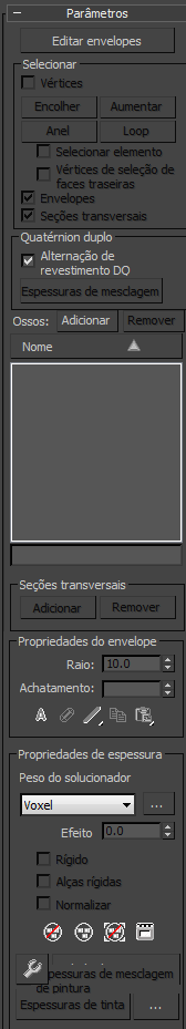 Os parâmetros implementação fornece controles para adicionar ossos para o modificador, ajustar invólucros e configuração Vertex Weights manualmente. Métodos alternativos para definir espessuras também estão disponíveis aqui.
