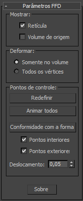 Também disponível estão dois modificadores de FFD mais configuráveis, consulte Modificador de FFD (Caixa/Cilindro) . Estes permitem definir qualquer número de pontos na retícula para maior flexibilidade de deformação do modelo.