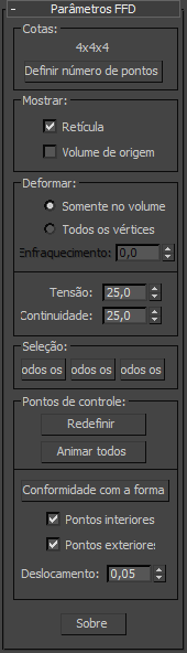 Ajusta as dimensões de unidade do volume de origem e especifica o número de pontos de controle na retícula. Observe que as dimensões de ponto também aparecem ao lado do nome do modificador a lista da pilha.