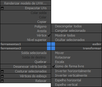 A barra de menus fornece acesso a uma ampla gama de funções de Editar UVWs. Consulte a barra de menus da caixa de diálogo Editar UVWs.