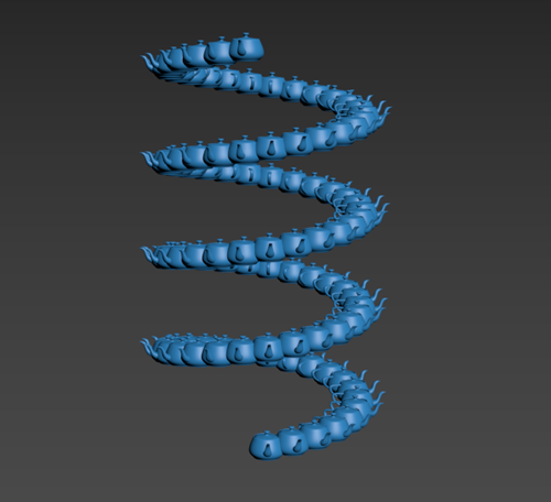 - Move cada clone de forma sucessiva tangencialmente (em direção/para fora) do eixo principal da matriz. Isso pode ser utilizado para criar um padrão espiral. No exemplo a seguir, Radial é definido como 0.3.