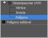 Se você aplicar Desempacotar UVW para uma seleção de uma face ou polígono de um objeto Editável/Editar Malha/Polígono, ou para uma seleção de patch ativa de um objeto Editável/Editar Patch, apenas essa seleção está disponível para editar como modificador. Se você alterar a face ou seleção de polígono no objeto, o modificador atualiza a seleção herdada e, novamente, torna apenas esses polígonos disponíveis para edição.