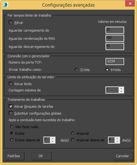 - Arquivar Arquiva o trabalho quando a renderização for concluída. Padrão=ativado.