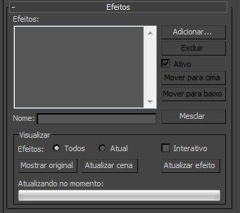 Quando ativado, as alterações ocorrerão interativamente na janela Quadro renderizado à medida que você ajustar os parâmetros de um efeito. Quando Interativo não estiver ativado, você poderá clicar em um dos botões de atualização para visualizar o efeito.