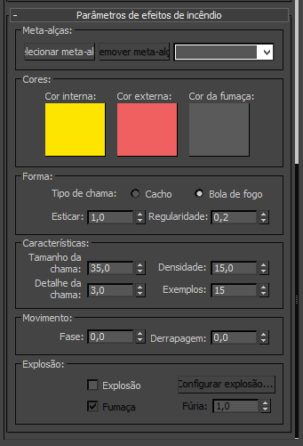 Cada efeito tem seus próprios parâmetros. Ao selecionar um efeito de fogo na lista Efeitos, seus parâmetros aparecem na Caixa de diálogo de ambiente.