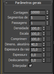 Quando ativado, o crescimento dos cabelos é interpolado entre os cabelos de guia, e a superfície é completamente preenchida com cabelos, de acordo com a configuração Parâmetros gerais. Quando desativado, Cabelos gera somente um cabelo por face triangular no objeto de crescimento, até o limite imposto pela configuração Contagem de cabelo. Padrão=ativado.