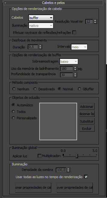 Nota: Essas configurações só se aplicam a cabelos renderizados em “buffer” (o tipo padrão, definido no grupo Opções de renderização de cabelo, como descrito acima).