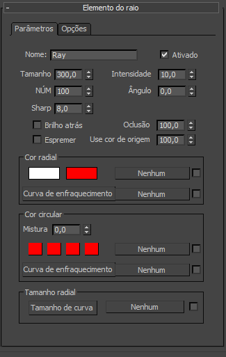 - Combina a cor de origem da luz ou objeto nos quais o efeito está sendo aplicado com a cor ou com o mapeamento definodo nos parâmetros Cor radial ou Cor circular. Um valor de 0 somente usa o conjunto de valores nos parâmetros de Cor radial e Cor circular, enquanto um valor de 100 somente usa a cor de origem da luz ou dos objetos. Qualquer valor entre 0 e 100 renderizará uma mistura entre os parâmetros da cor de origem e os parâmetros de cor do efeito.