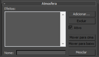 A lista exibe somente os nomes dos efeitos atmosféricos, mas quando se mescla um efeito, as luzes ou alças associadas a esse efeito também são mescladas. Se um destes objetos está sendo mesclado tiver o mesmo nome que um já existentes na cena, aparece um alerta com as seguintes opções: