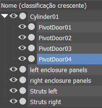Quando você executar as etapas anteriores, a hierarquia no painel Explorer da cena será atualizada para mostrar que a partir de agora as portas são elementos secundários do Cilindro01. Ao terminar, a lista de objetos deverá ter este aspecto: