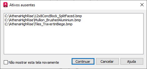 Esta caixa de diálogo é exibida quando você tenta renderizar uma cena com mapas de textura cujo caminho não é mais atual. Isso pode ocorrer se os mapas de textura forem movidos ou excluídos ou se o arquivo de desenho foi movido para um computador com mapeamentos de unidade de disco diferentes.