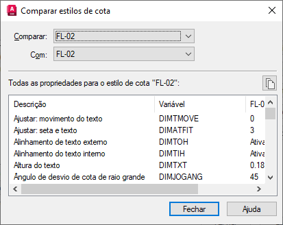 Compara as propriedades de dois estilos de cota ou exibe todas as propriedades de um estilo.