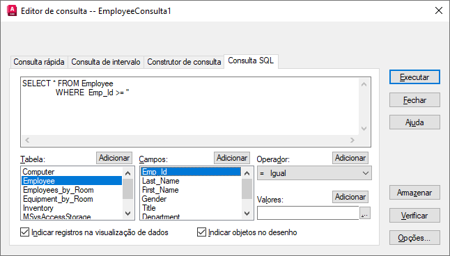 Fornece um espaço para você inserir uma consulta SQL com forma livre ou adicionar elementos selecionados utilizando diversas ferramentas de Consulta SQL.