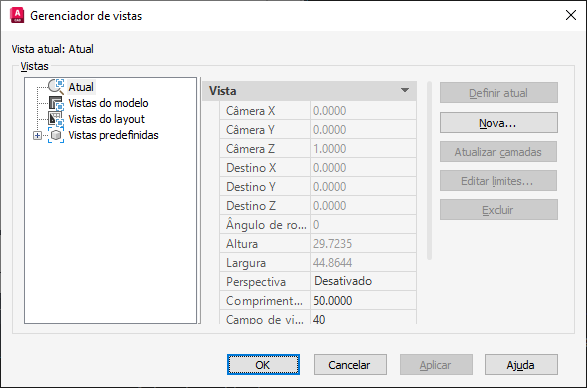 • Atual. Exibe a vista atual e suas propriedades de vista e corte