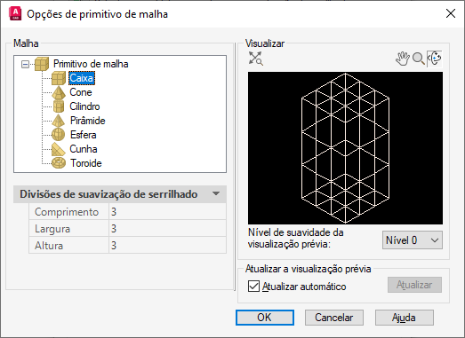 Os padrões definidos na caixa de diálogo Opções de primitivo de malha, controlam a aparência de novos objetos de malha primitiva. As malhas primitivas incluem caixas, cone, pirâmides, cilindros, esferas, cunhas e toroides.