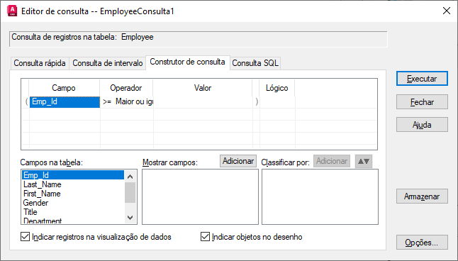 É possível também agrupar os critérios entre parênteses, selecionar quais campos devem ser exibidos na consulta retornada e especificar uma ordem de classificação para os campos.