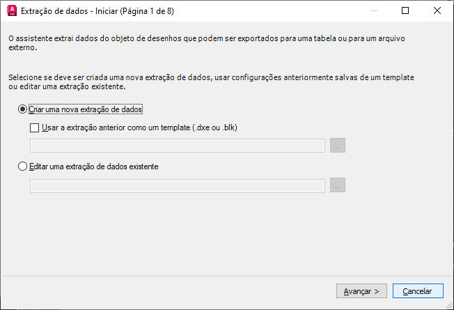 Inicia o processo de extração de dados. As opções incluem a criação de uma nova extração de dados, usando um modelo ou editando uma extração de dados existente.