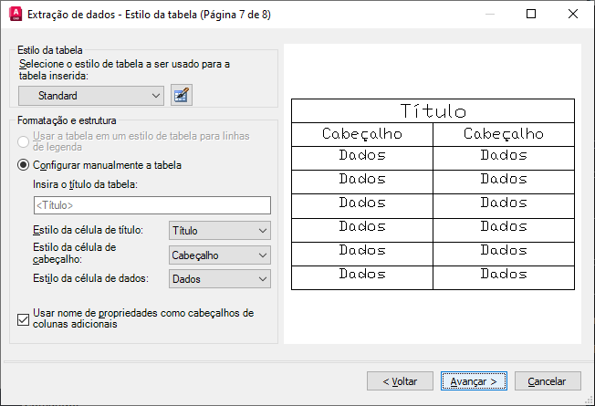 Controla a aparência da tabela de extração de dados. Esta página é exibida somente se na página Selecionar saída for selecionado Tabela do AutoCAD.