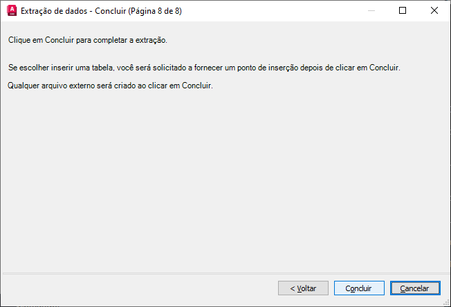 Completa o processo de extrair os dados de propriedades do objeto especificados no assistente, e cria o tipo de saída que foi especificado na página Selecionar saída. Se na caixa de diálogo Vincular dados externos tiverem sido definidos vínculo de dados e correspondência de colunas com uma planilha do Excel, os dados selecionados na planilha também serão extraídos.