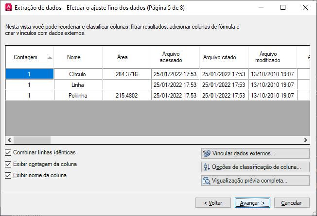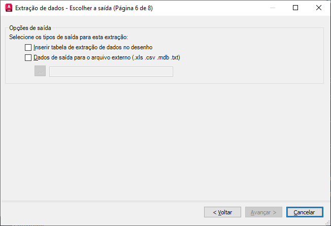 As informações são usadas para criar uma tabela de extração de dados no desenho atual ou são salvas em um arquivo externo, ou ambos.