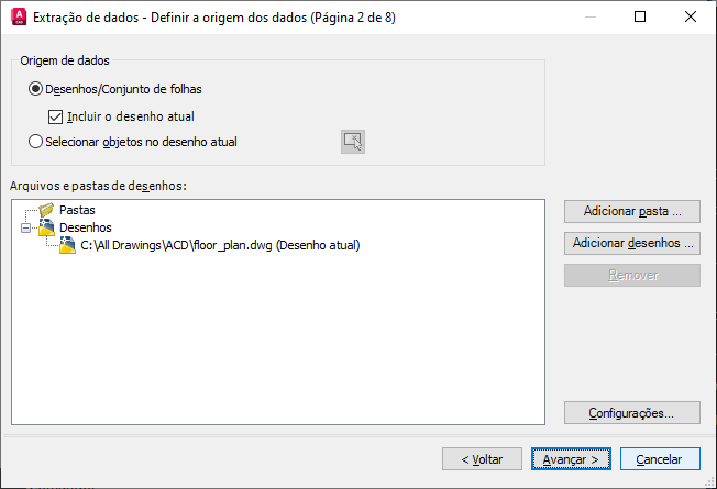 Especifica os arquivos de desenho, incluindo pastas das quais extrair os dados. Permite a seleção de objetos no desenho atual do qual extrair as informações.