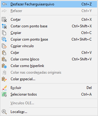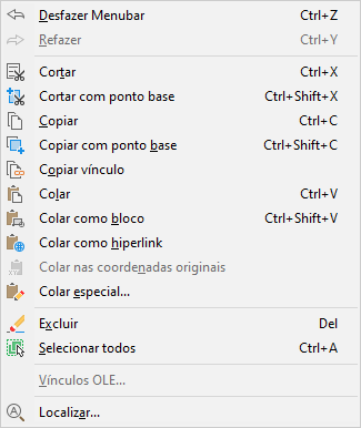 O acento til (~) e o ponto de exclamação seguido por um ponto final (!.) são colocados no início do rótulo do comando Copiar link, na propriedade Nome, do painel Propriedades. O seguinte item é o resultado de Copiar link, acinzentado e marcado, no menu Editar.