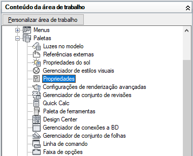 3. No painel Conteúdo do espaço de trabalho, clique no sinal de mais (+) ao lado do nó Paletas para expandi-lo.