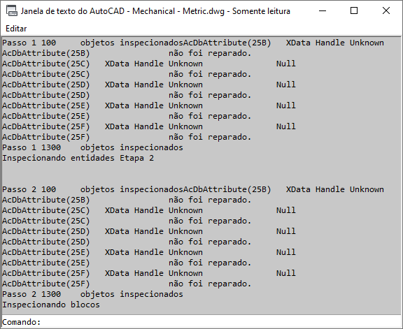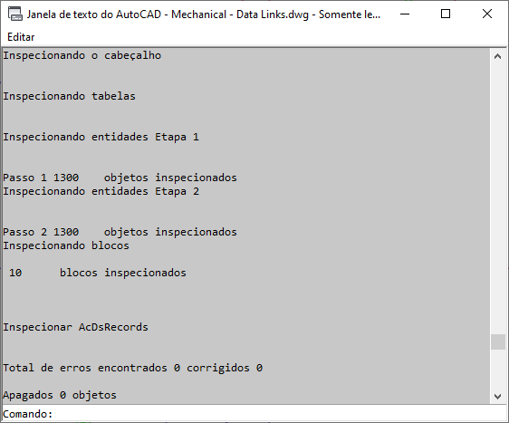 Se o desenho aberto contiver erros, o número de erros encontrados e corrigidos será exibido junto com o número de objetos apagados porque não puderam ser corrigidos.