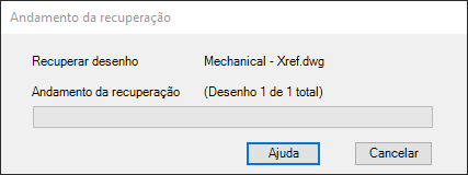 A caixa de mensagem Andamento da recuperação é exibida e informa o andamento da inspeção dos arquivos de refex anexados ao desenho.