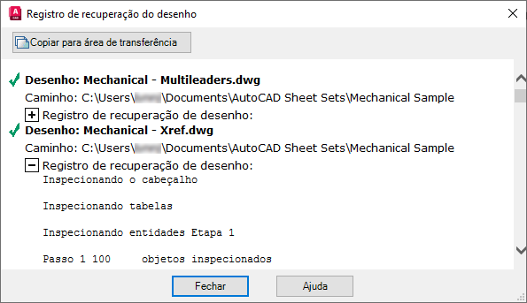 Nota: Após abrir um arquivo de desenho no Gerenciador de recuperação de desenho, será recomendável executar uma inspeção no desenho para verificar se existem erros antes de continuar a trabalhar no desenho.