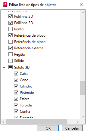 - Na caixa de diálogo Editar lista de tipos de objetos, clique nos tipos de objetos para os quais deseja exibir propriedades na paleta Propriedades rápidas.