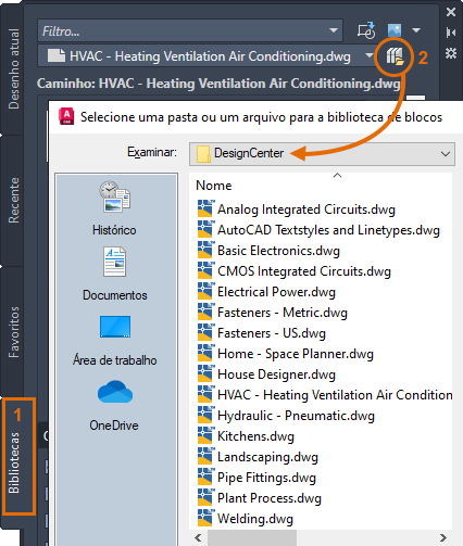 - Para escolher um desenho de biblioteca diferente na pasta DesignCenter, verifique que a guia Bibliotecas seja a atual (1) e clique no botão de navegação do arquivo (2).