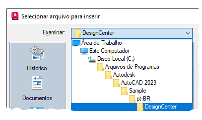 - Navegue até a pasta do DesignCenter, onde uma variedade de desenhos de amostra é armazenada.