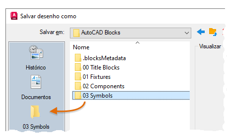 Dica: Quando você salvar desenhos para inserção posterior, navegue até uma pasta, clique com o botão direito do mouse e crie várias pastas para organizar os desenhos. É possível arrastar um ou mais deles para a barra de Locais para facilitar o acesso no futuro.