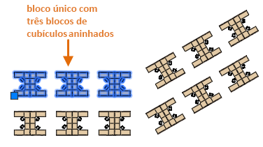 - Uma ou mais definições de bloco criadas no desenho atual. Por exemplo, você pode desejar criar um bloco com base em um conjunto de objetos que aparecem repetidamente no desenho, como a seguinte organização de cubículos que contém múltiplos blocos aninhados. Todos os blocos usados na organização do cubículo podem ser combinados em um bloco único para vários posicionamentos.