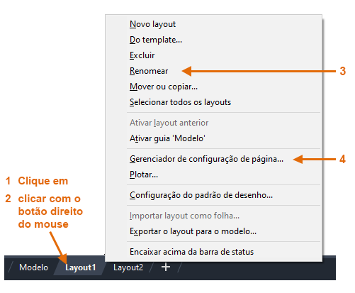 A primeira coisa que você deve fazer quando acessa uma guia de layout (1) é clicar com o botão direito do mouse na guia (2) para renomeá-la (3) com um nome mais específico do que Layout 1. Os nomes que fazem referência a um determinado tamanho ANSI ou ISO podem ser uma boa escolha.