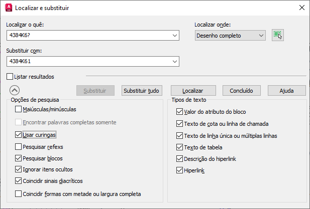 Por exemplo, se você tiver diversas peças parecidas no desenho, mas precisar alterar todas elas para 4384K61, insira 4384K6? na caixa Localizar e 4384K61 na caixa Substituir.