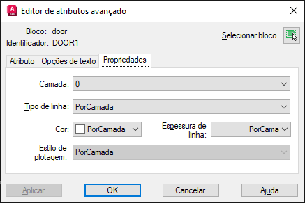 Define a camada que o atributo está e a cor, espessura e tipo de linha do texto do atributo. Se o desenho utilizar os estilos de plotagem, você pode designá-lo ao atributo utilizando a guia Propriedades