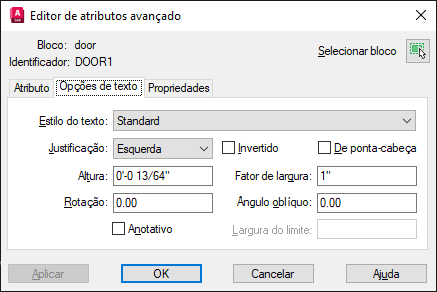 Configura as propriedades que definem a forma como o texto de um atributo é exibido no desenho. Altere a cor do texto do atributo na guia Propriedades.