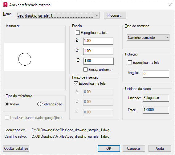Selecione o caminho completo (absoluto), o caminho relativo para a referência externa ou nenhum caminho, o nome da referência externa (o arquivo precisa estar localizado na mesma pasta do arquivo de desenho atual).