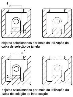 Com uma seleção de janela, normalmente todo o objeto precisa estar dentro da área de seleção retangular. No entanto, se um objeto com um tipo de linha não contínua (tracejada) só estiver parcialmente visível na viewport e todos os vetores visíveis do tipo de linha puderem ser circundados pela janela de seleção, o objeto inteiro será selecionado.