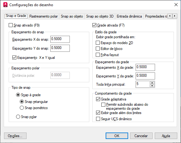 Se esse valor for 0, a distância do PolarSnap assumirá o valor de Espaçamento X do snap. A configuração Distância polar é utilizada juntamente com o rastreamento polar e/ou com o rastreamento de snap a objeto. Se nenhum dos recursos de rastreamento estiver ativado, Distância polar não terá efeito.