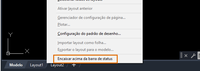 Clique com o botão direito do mouse na guia Modelo ou Layout e selecione Encaixar acima da barra de status ou Encaixar na linha com a barra de status.